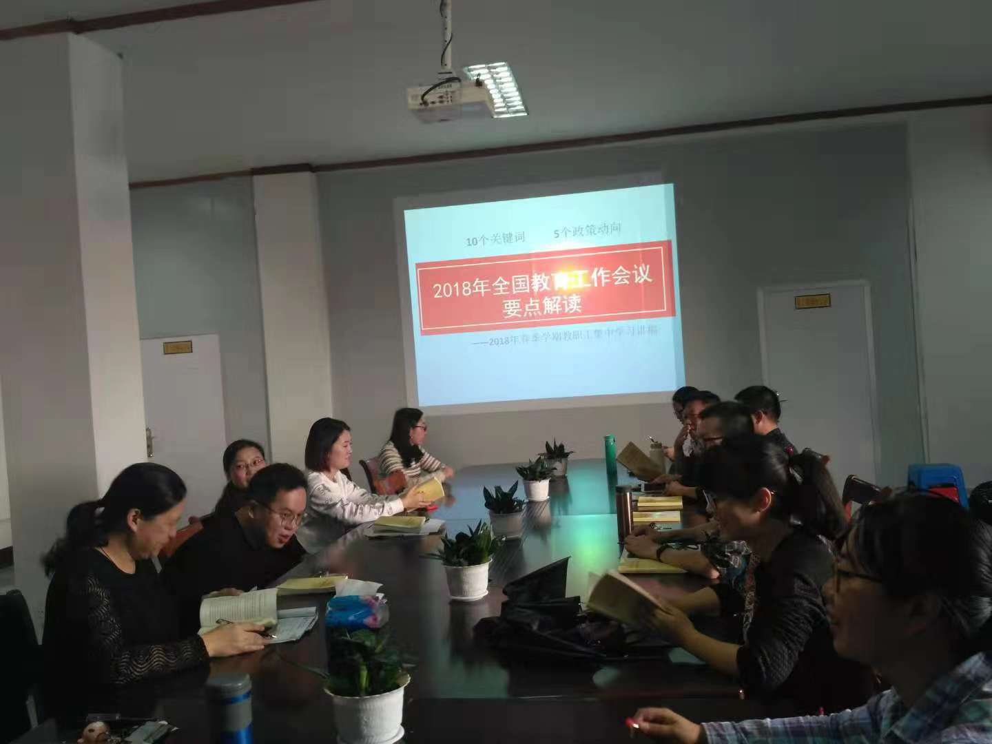 2018年10月24日下午3:00,我院全体教工党员在郑燕娥书记的带领下,于泽川楼四楼会议室学习了全国教育工作会议相关要点。