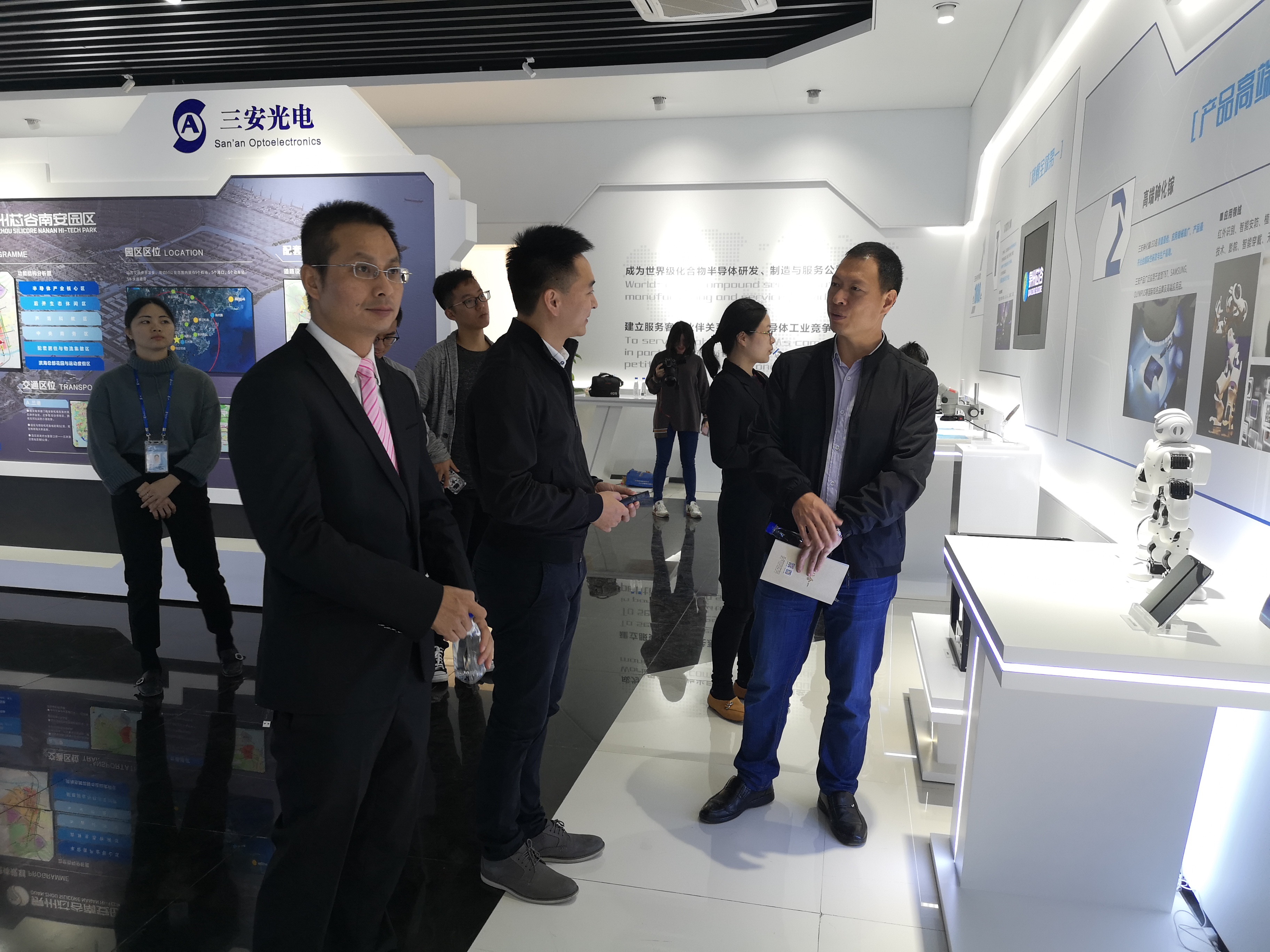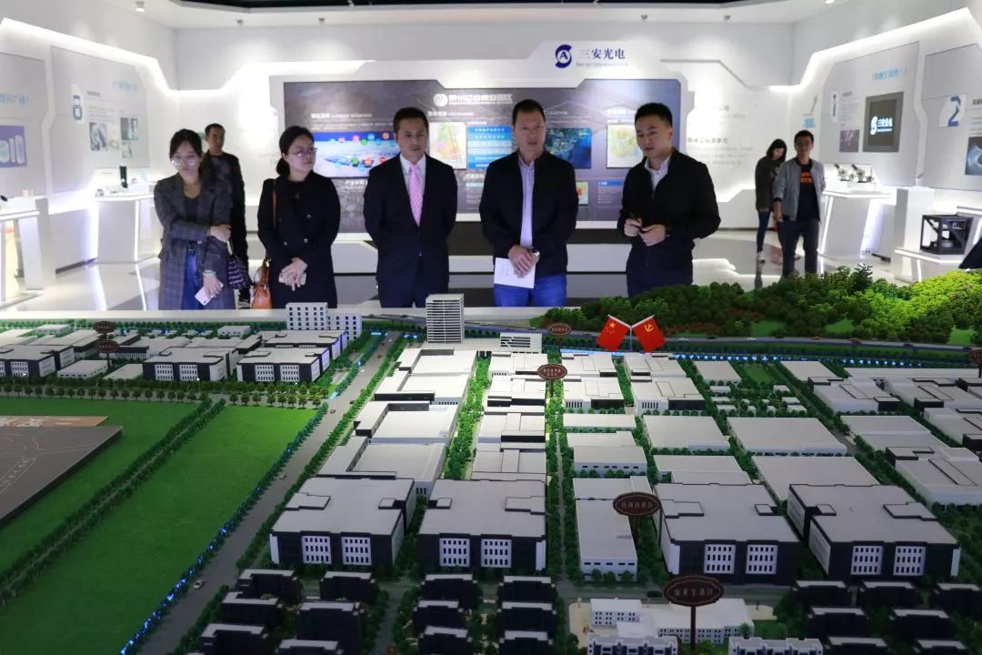 园区综合协调办副主任廖汜彬向考察组一行介绍园区的整体概况、区位优势和开发建设情况。了解了三安项目规划建设、八大核心业务等情况以及介绍海峡科技生态城A片区项目概况、进展情况和未来蓝图。