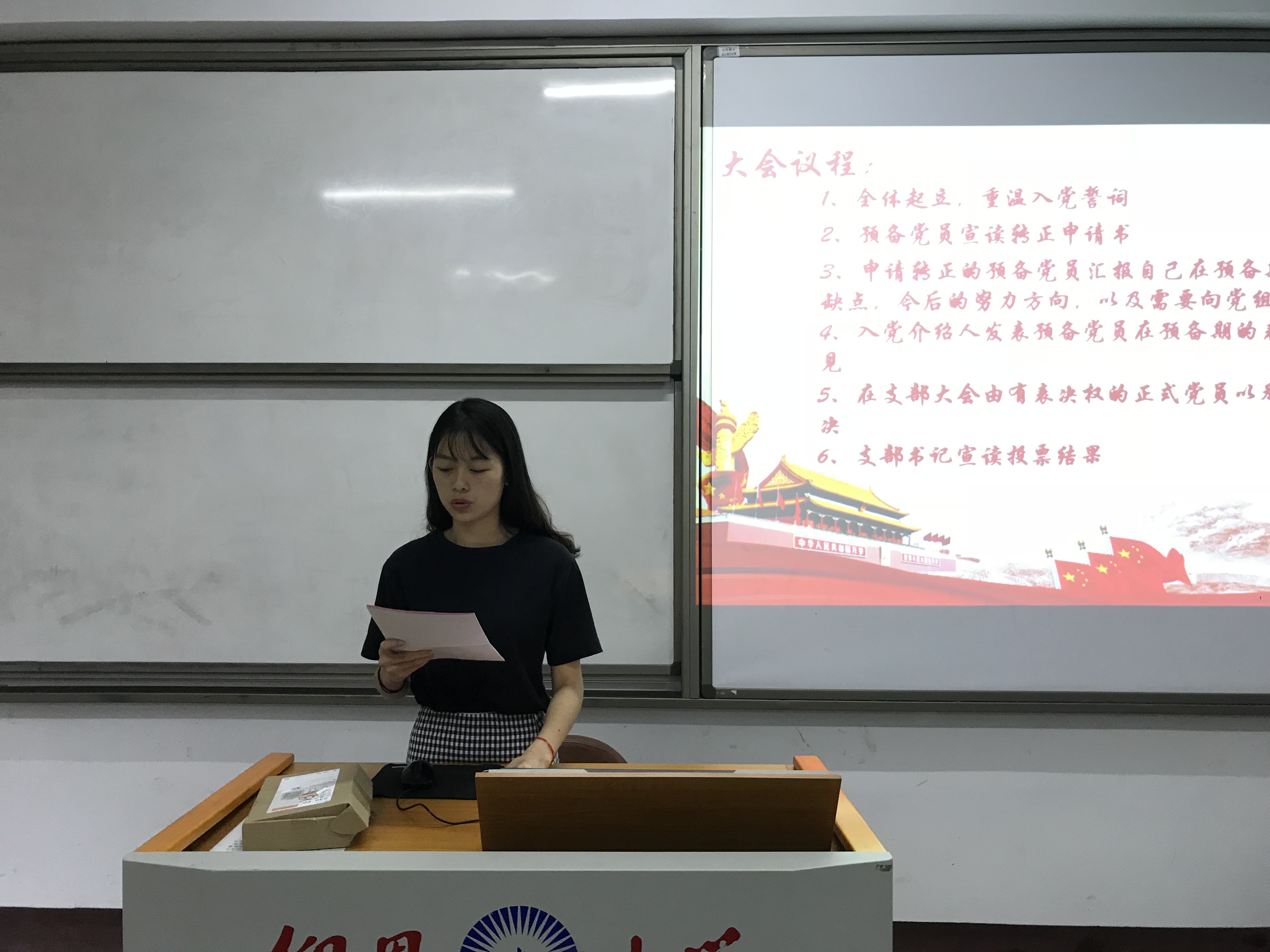 会议开始,全体党员重温入党誓词,牢记入党初心,永葆党性纯洁;支部书记介绍转正流程:预备党员宣读转正申请书,预备党员汇报预备期表现,入党介绍人发表意见,支部党员举手表决。