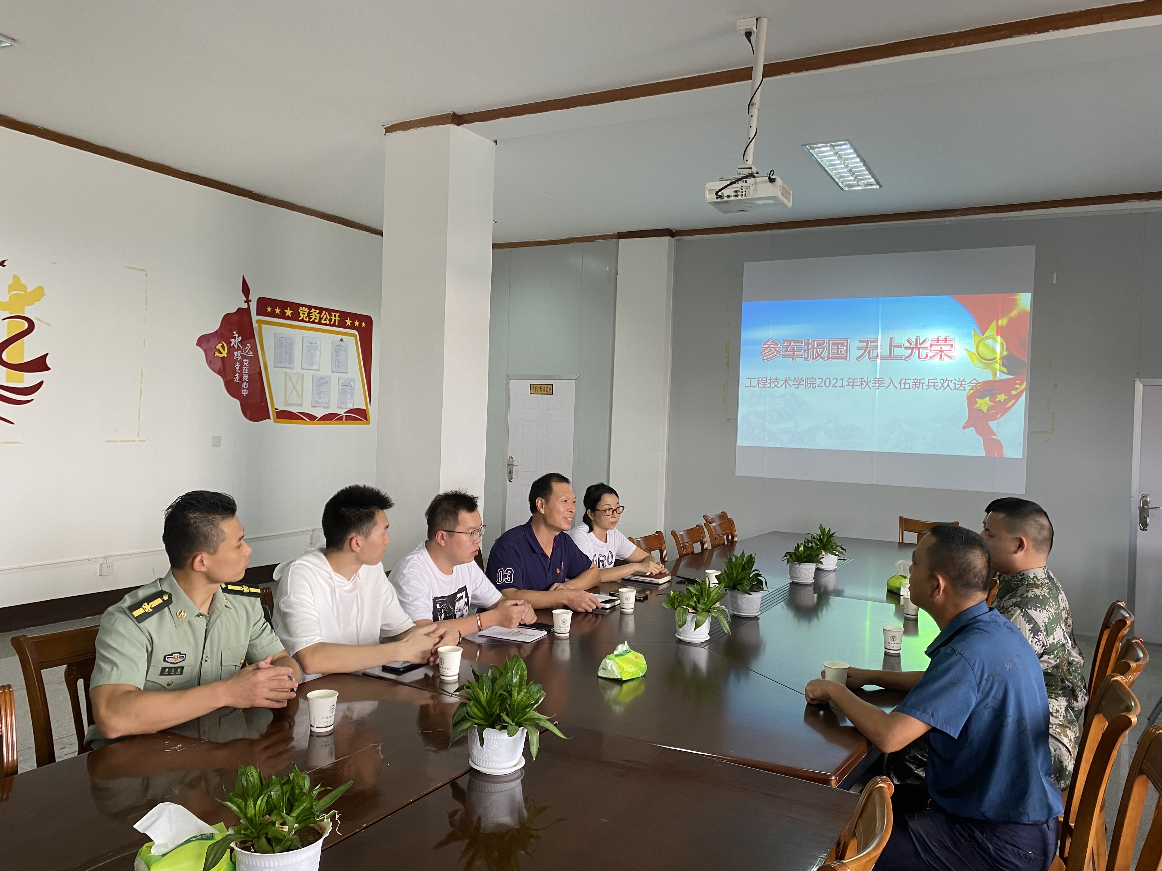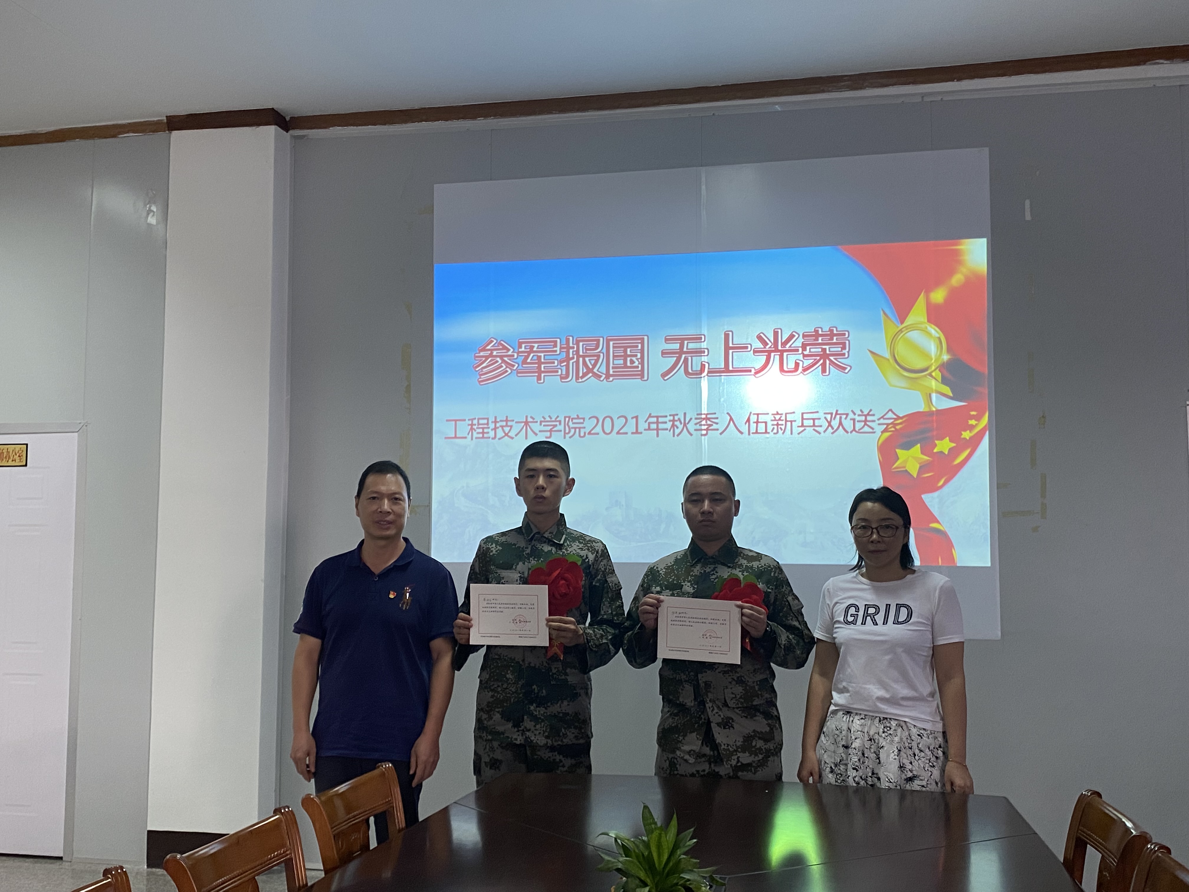 9月9日下午,yl6776永利集团2021年直招士官入伍欢送会在泽钏楼四楼举行,欢送陈杰松、黄伟龙两位同学应征入伍。学院党总支书记曾凤生、副院长李影、党总支副书记吕思仁、校武装部曾文档等老师出席了欢送会。
