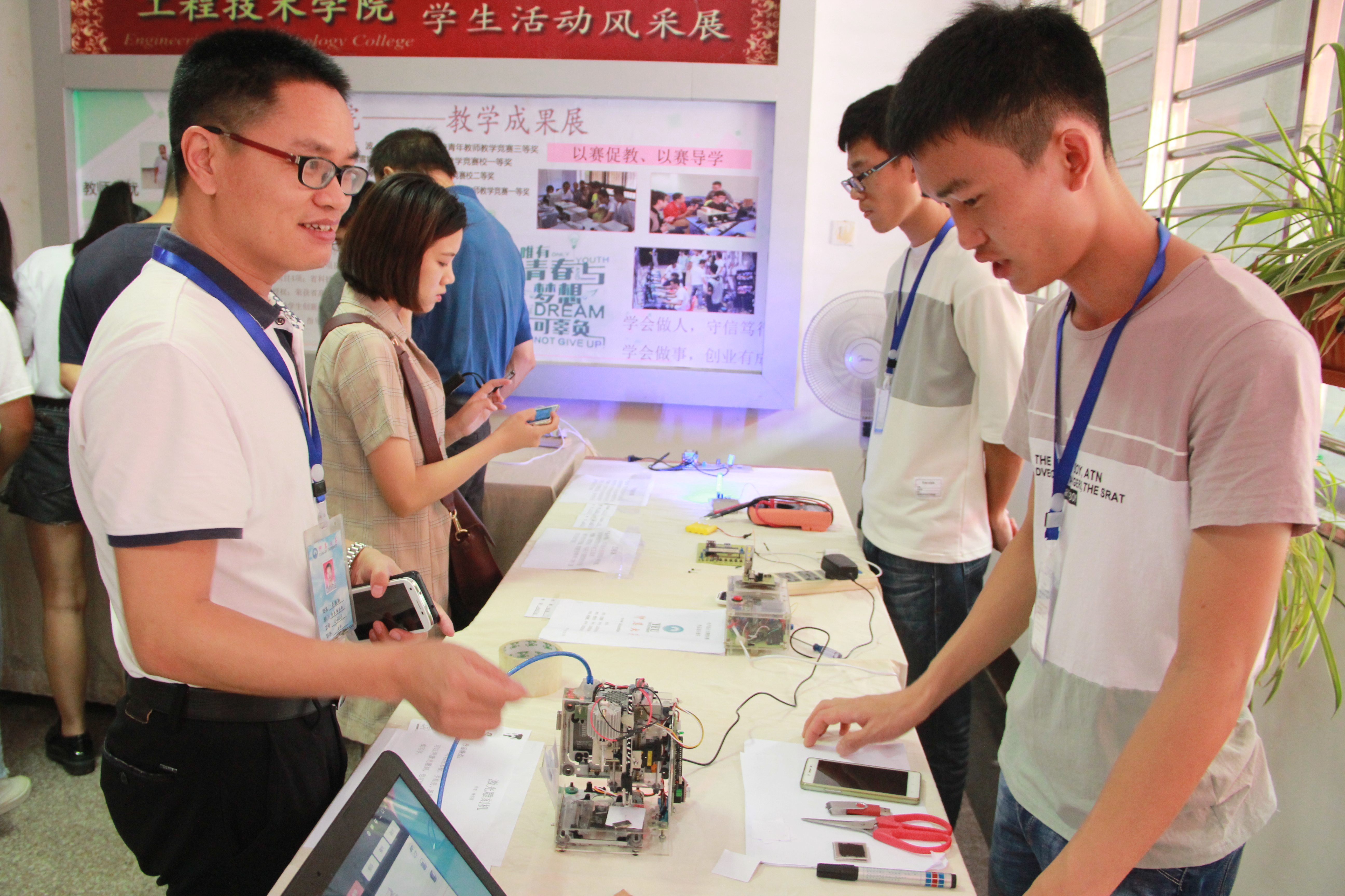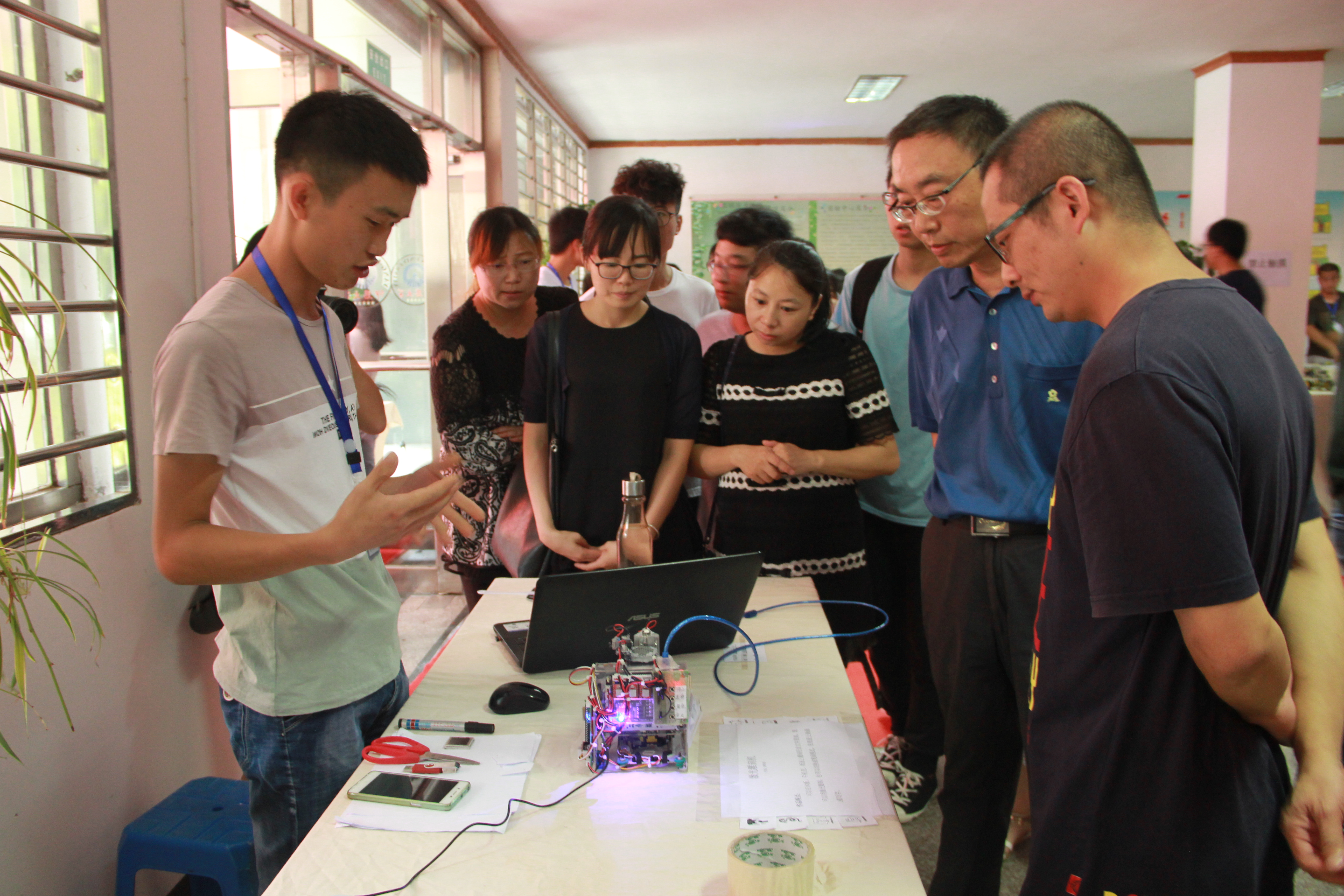 6月14日下午,由yl6776永利集团主办的第一届创新创意科技作品展在泽钏楼一楼大厅举行。副校长许总,学生事务部主任吴胜潮,yl6776永利集团常务副院长金承勇、党总支书记兼副院长曾凤生,教务部副主任郑秋莲、赵芳芳等到场并观看作品展。