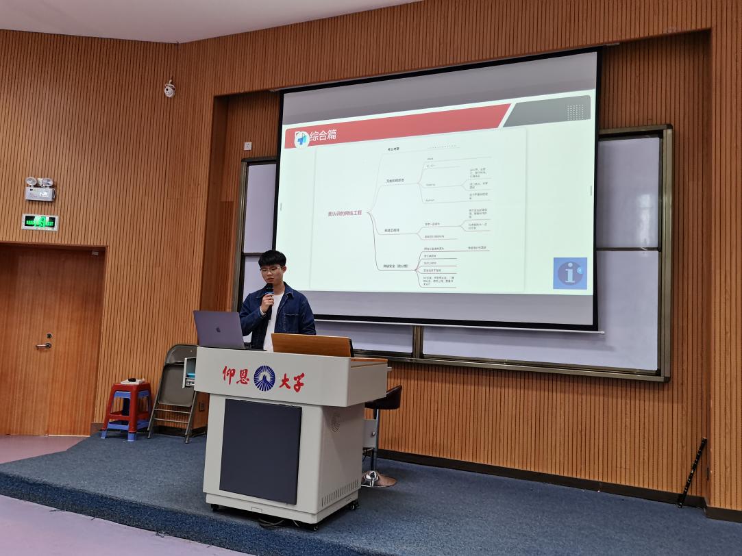 会上,徐闽杰围绕网络工程专业“学什么、怎么学、如何深入学”,向大家分享自己对专业的认识和探索,他鼓励大家积极参加各类项目和比赛,通过项目实践和比赛不仅可以学习到课本以外的知识,更是提升视野、拓展学习途径的好机会。随后,在现场提问环节中,同学们对如何参加网络攻防项目最感兴趣,徐闽杰对此也做出了相应解答和建议。
