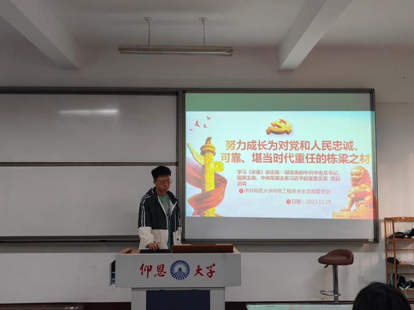 为深入学习党的理论知识,2023年11月29日,网络工程系学生党支部在第三教学区仰恩教学楼B5-201教室开展“努力成长为对党和人民忠诚、 可靠、堪当时代重任的栋梁之材”主题党日活动。本次活动由学生党员蔡培超同志主持,全体学生党员参与。