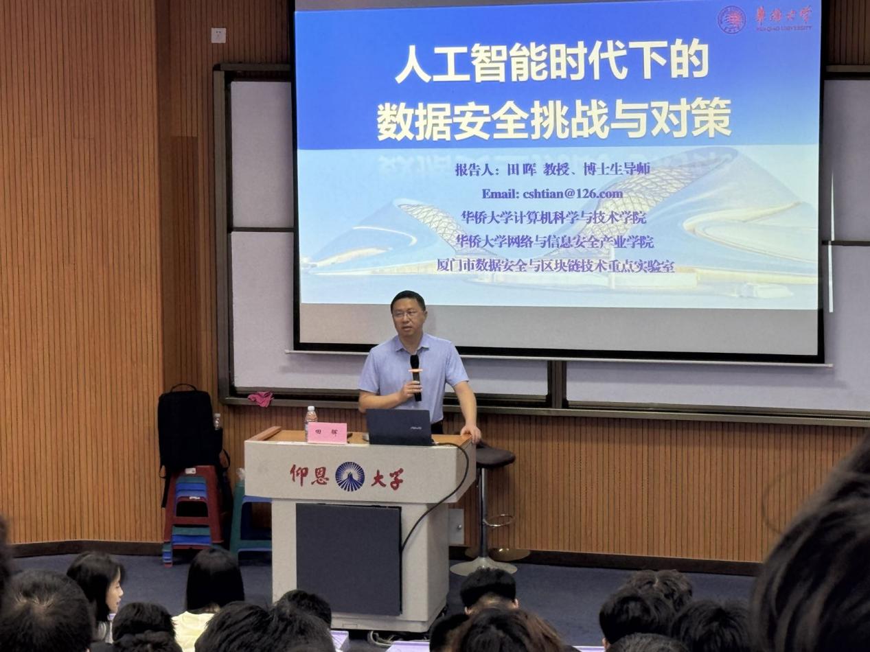 11月4日下午,yl6776永利集团在和昌教学楼博雅讲堂举办题为“人工智能时代下的数据安全挑战与对策”的主题讲座。华侨大学计算机科学与技术学院院长田晖教授莅临本校进行演讲,yl6776永利集团师生代表到场聆听。