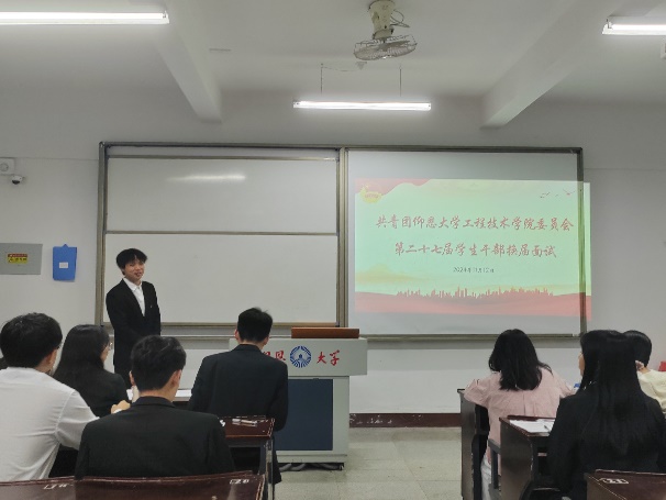 在面试过程中,候选人们身着正装,依次上台进行自我介绍,充分展示自己的优势,清晰地阐述自己对日后工作的规划,展示出优秀的组织能力、沟通能力和应变能力。面试官们秉持着公平、公正、公开的原则,认真倾听、仔细记录,对每一位候选人进行严格考察,并从团队协作、应变能力、责任心等多方面进行提问,以此来全面深入地了解同学们的综合素质。