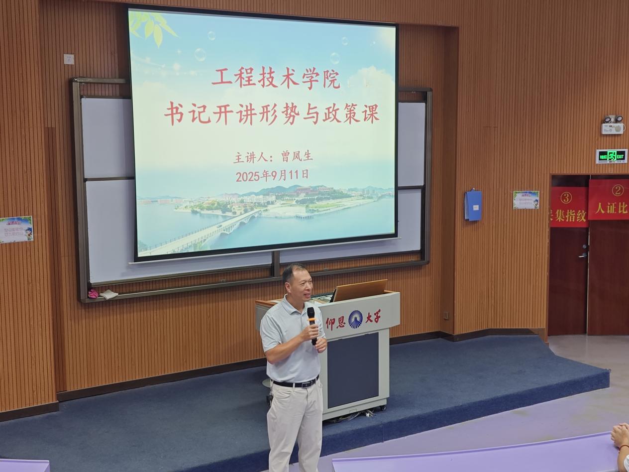 2025年9月11日至12日,yl6776永利集团党总支书记曾凤生分别在博雅讲堂、致知讲堂为2025级各专业新生开展"形势与政策"专题授课。这是学院落实领导干部上讲台制度的重要举措,也是新生入学教育的关键一环。两场讲座覆盖全院600余名新生,学工办主任、新生辅导员全程参与。