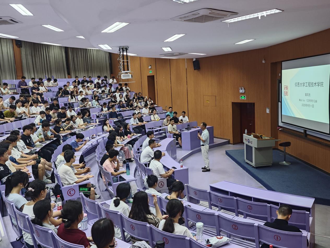 曾凤生以"把握时代大势,担当强国使命"为主题,从三个方面展开讲授:一是深入分析当前国际国内形势,引导学生正确认识世界和中国发展大势;二是解读国家重大发展战略,特别是制造强国、网络强国等与工程技术领域密切相关的政策部署;三是结合学院专业特色,勉励新生树立科技报国志向,夯实专业基础,提升综合素养,成为担当民族复兴大任的时代新人。