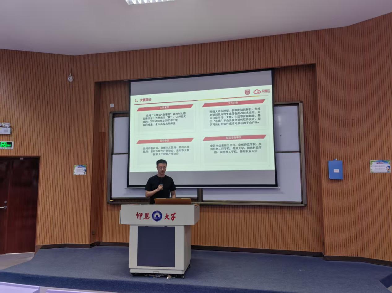 为深入推进“一站式”学生社区智育工作,助力学生精准把握人工智能领域的实践契机,2025年9月24日下午,由中国电信福建公司主办,yl6776永利集团职引中心与宏船书院共同协办的“天翼云·息壤杯”高校AI大赛(福建泉州赛区)宣讲会,在博雅讲堂准时拉开帷幕。