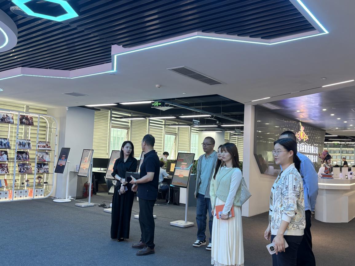 公司负责人陈苹对曾凤生一行的到访表示热烈欢迎,并热情引导学院调研团队先后参观了企业办公区、项目制作区及数字技术体验空间,详细了解企业发展历程、核心业务及创新成果。